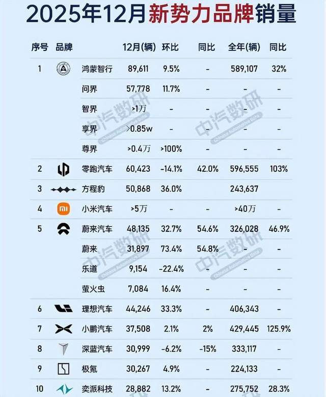 对比下面这张12月份的销量图,大家会发现不管是问界,还是小米,还是零跑,理想,蔚来等等,都在下滑,并且很多品牌都是环比下滑40%+这种大幅度的。