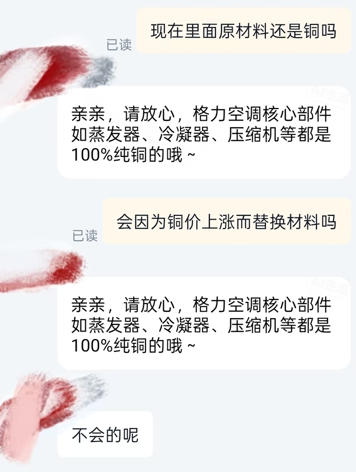 记者在线上购物平台咨询了美的、格力、松下等品牌的官方客服。美的空调官方客服表示:“空调具体售价以平台页面显示为准,目前暂无法预测是否会涨价,也未收到明确的调价通知。同时,美的空调换热器均采用全铜管材质,请勿被网络上的不实消息误导。”